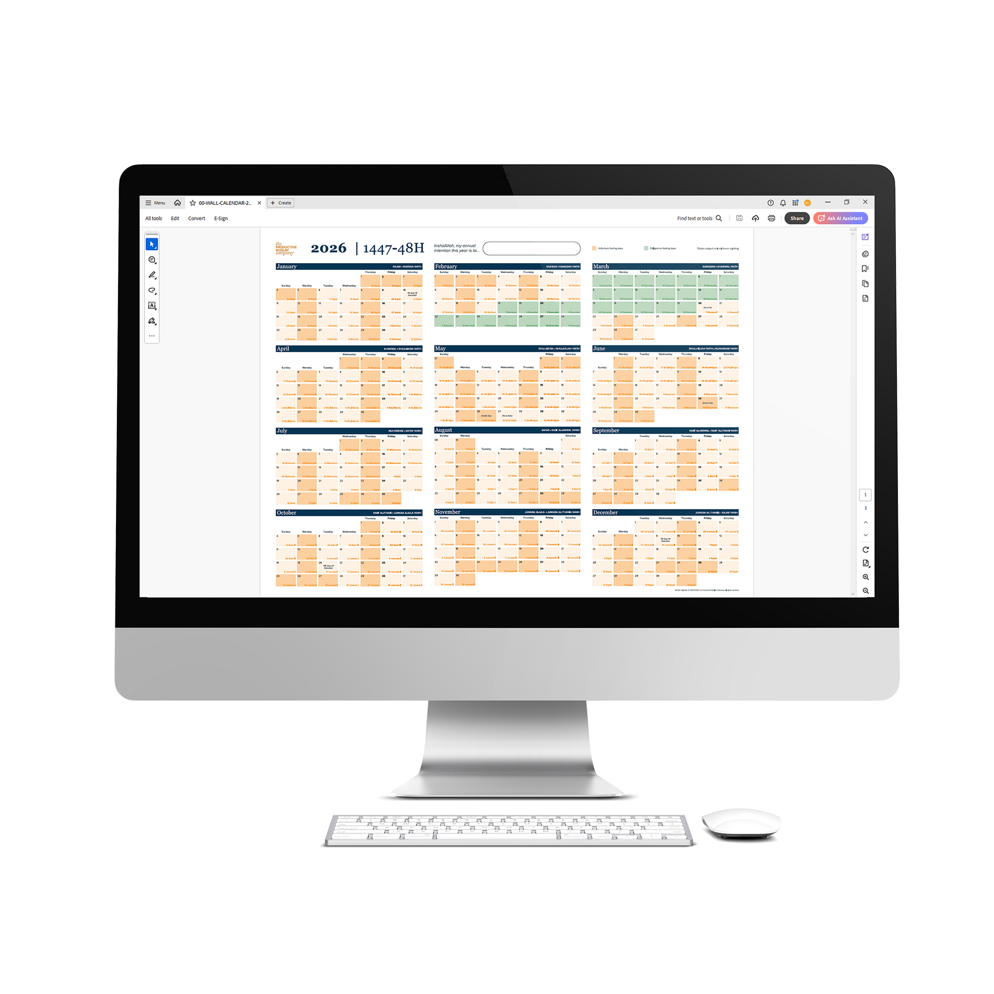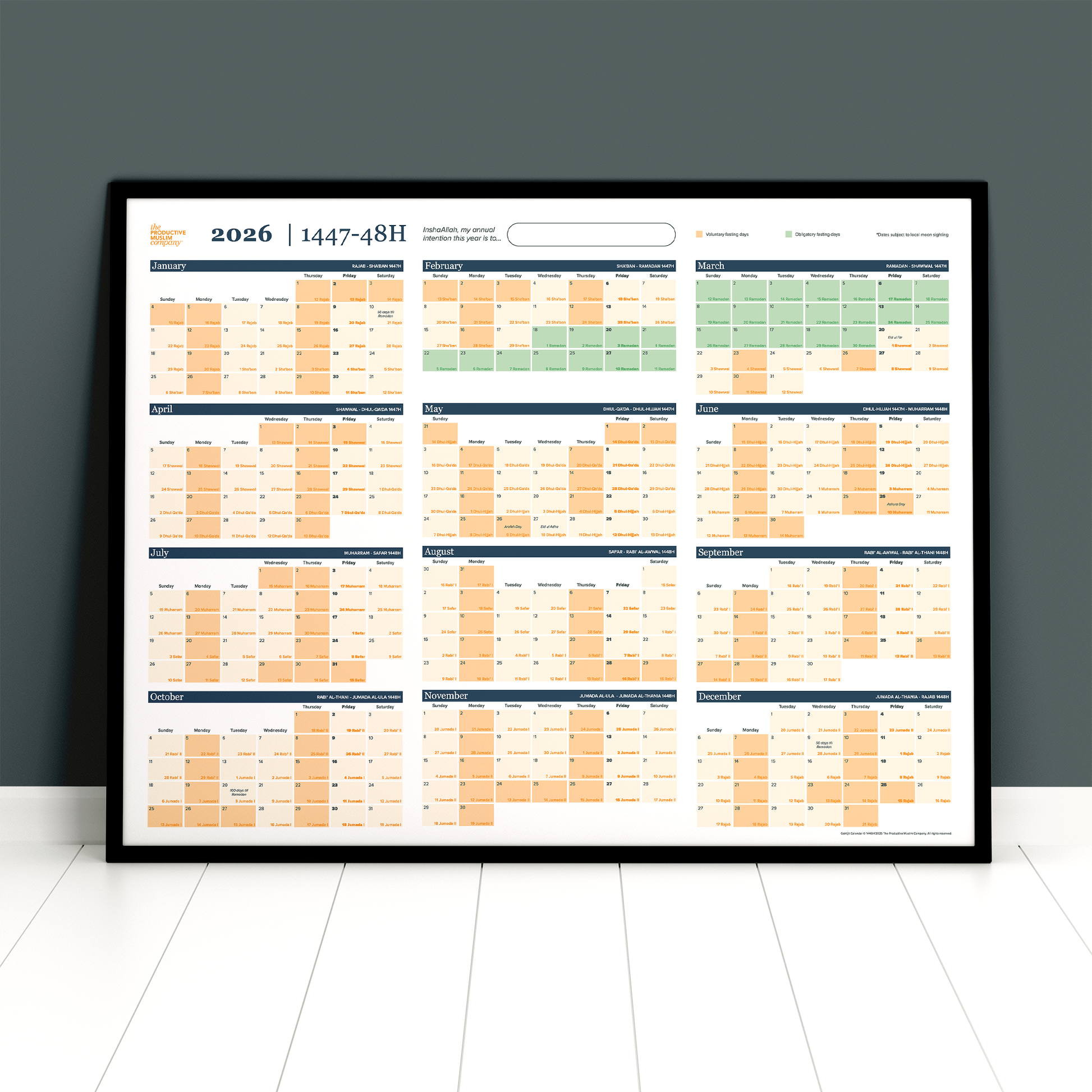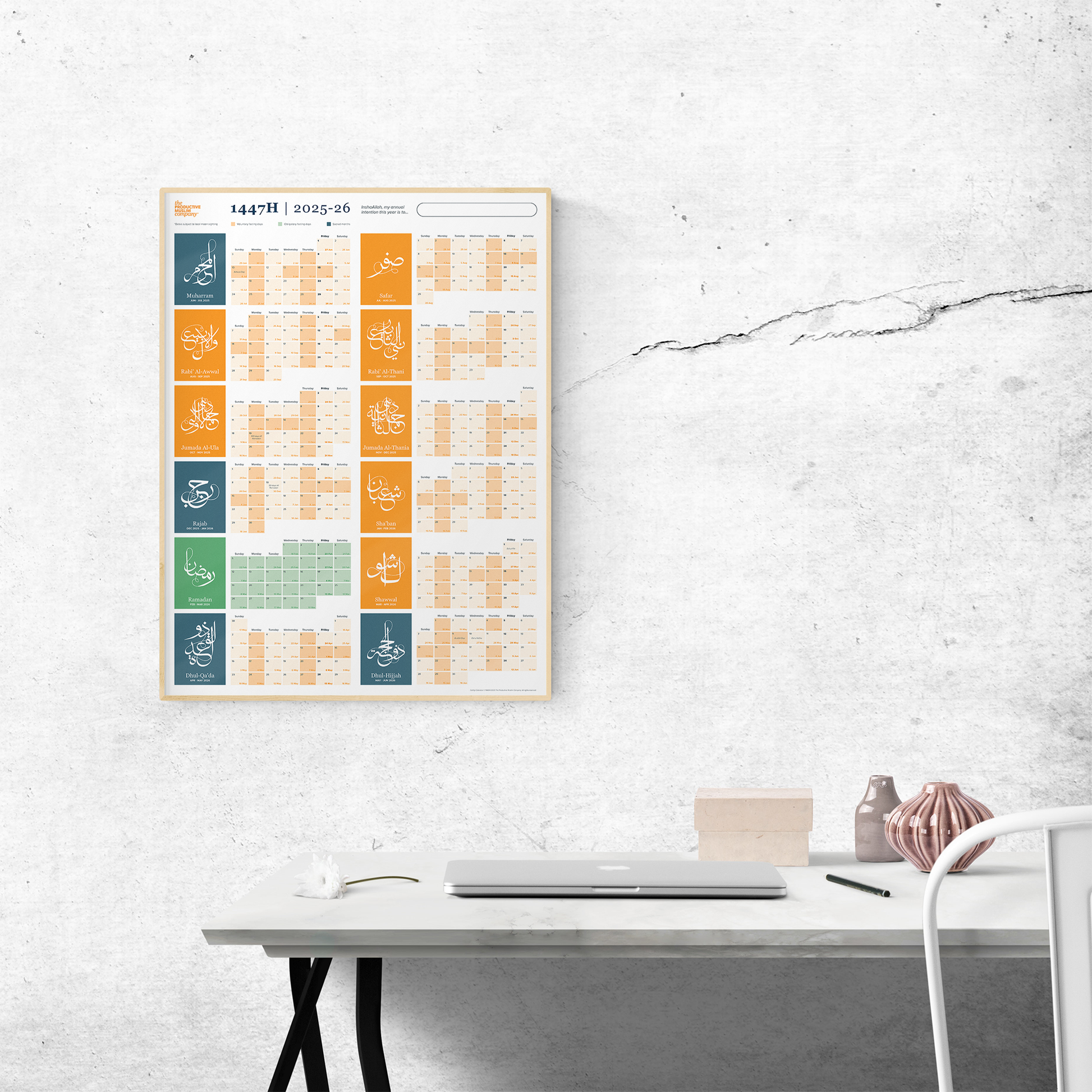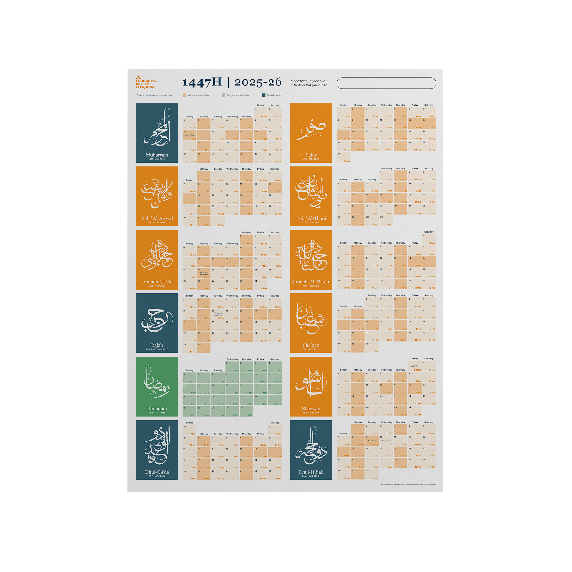 Order The Productive Muslim Company Hijri-first calendar today for the year 1447H (which also displays the corresponding Gregorian dates for the year 2025-26) and revive the Islamic calendar in your personal and professional life.